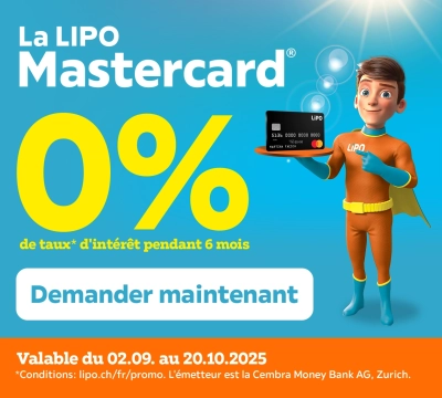 *Si vous payez vos achats chez LIPO Einrichtungsmärkte AG entre le 02.09 et le 20.10.25 avec votre LIPO Mastercard®, aucun intérêt n'est dû pendant les 6 premiers mois en cas d'utilisation de l'option de paiement par acomptes (paiement minimum : 3% du montant de la facture, mais au moins CHF 50.- par mois). A l'issue des 6 premiers mois, vous pouvez payer le montant restant dans son intégralité ou continuer à utiliser l'option de paiement par acomptes. En cas de paiement partiel, le taux d'intérêt de 13% s'applique à partir du 7e mois. Exemple de calcul: un montant d’achat de CHF 1’350.– avec paiement échelonné et mensualités de CHF 75.45 entraîne des intérêts de CHF 159.– pendant 20 mois (taux d’intérêt annuel 13%) et un prix d’achat total de CHF 1'509.–. L’octroi d’un crédit est interdit s’il conduit à un surendettement du consommateur (art. 3 LCD). L’émettrice est Cembra Money Bank SA, Zurich.